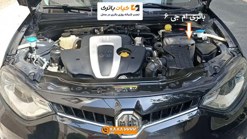 شکل زیر محل باتری ماشین MG6 را نشان می دهد. باتری این خودرو در قسمت کاپوت جلو سمت راننده جای گرفته است و باتری به وسیله کاور نمدی پوشانده شده است. این کاور به عنوان محافظ باتری جلوی گرمای موتور عمل می کند. برای تعویض ونصب باتری جدید روی این خودرو کار سختی در پیش نداریم و با باز کردن سرباتری های مثبت و منفی و پایه های نگهدارنده باتری می توان باتری را جابجا کرد.