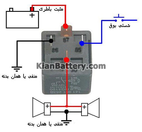 نکته : در برخی از شرکتها بجای استفاده از سیم مثبت در شستی بوق (کلید بوق)، از سیم منفی استفاده می کنند. پس در صورتی که سیم شستی را به پایه 85 متصل و پایه 86 را بدنه کردید و با فشردن شستی بوق، رله عمل نکرد، بعد از اطمینان از صحت عملکرد شستی بوق و رله، بالعکس حالت قبل عمل کنید یعنی پایه 85 را بدنه و پایه 86 را به سیم مثبت متصل کنید.