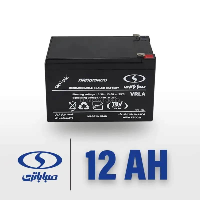 باتری 12 آمپر صبا، از تولیدات باکیفیت شرکت صبا باتری بوده و با تکنولوژی پیشرفته سیلد اسید (VRLA) طراحی شده است. این باتری قابل شارژ (Rechargeable Sealed Battery) بوده و با ولتاژ 12 ولت و ظرفیت 12 آمپر ساعت (12V 12Ah)، عملکردی قدرتمند و پایدار ارائه می‌کند.